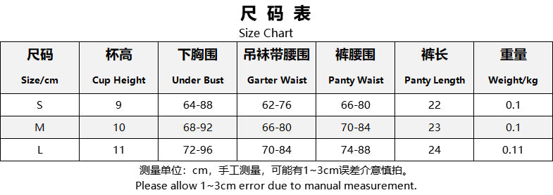 | Size | Cup Height | Under Bust | Garter Waist | Panty Waist | Panty Length |