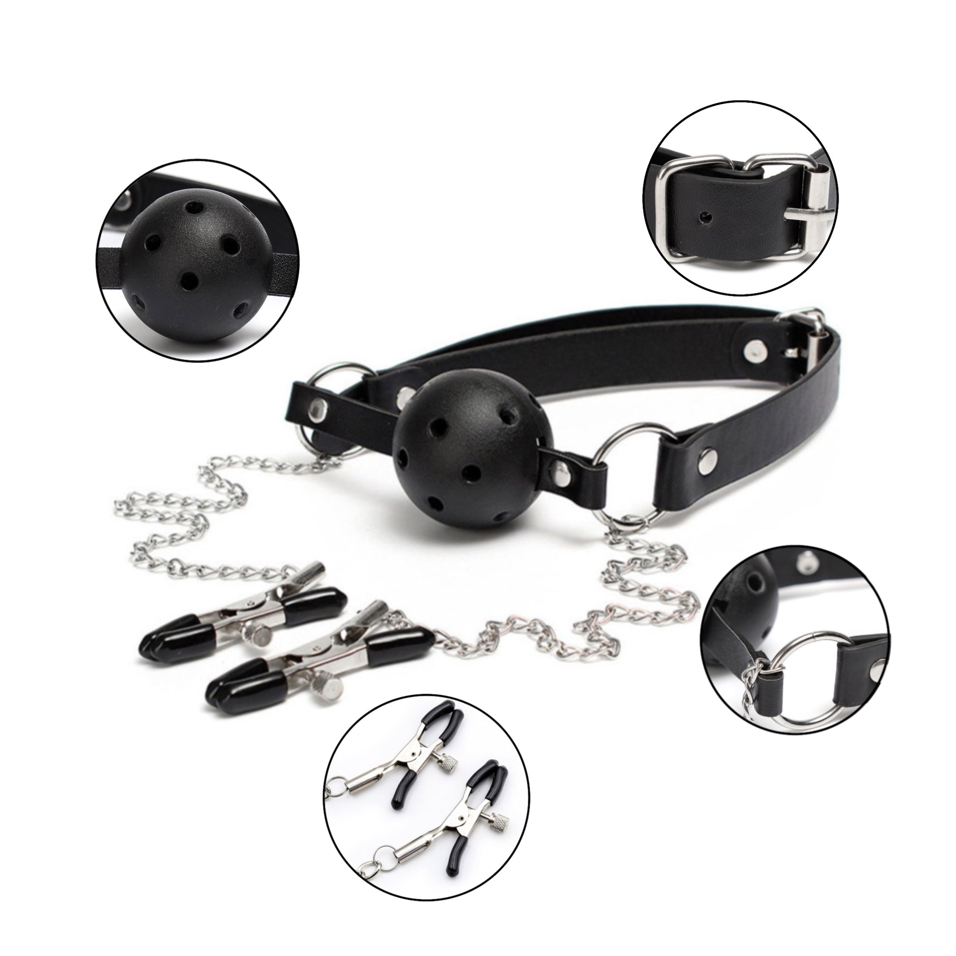 Experience the ultimate sensory experience with the Open Ball Gag With Nipple Clamps from the Softouch Fetish Collection. This sleek black ball gag is constructed of smooth, odorless plastic and features air holes for comfortable wear. The adjustable faux leather head strap ensures a personalized fit, while the attached chains and adjustable clamps offer a range of stimulating sensations. Trust in our expertise for an unbeatable gag and clamp combination.