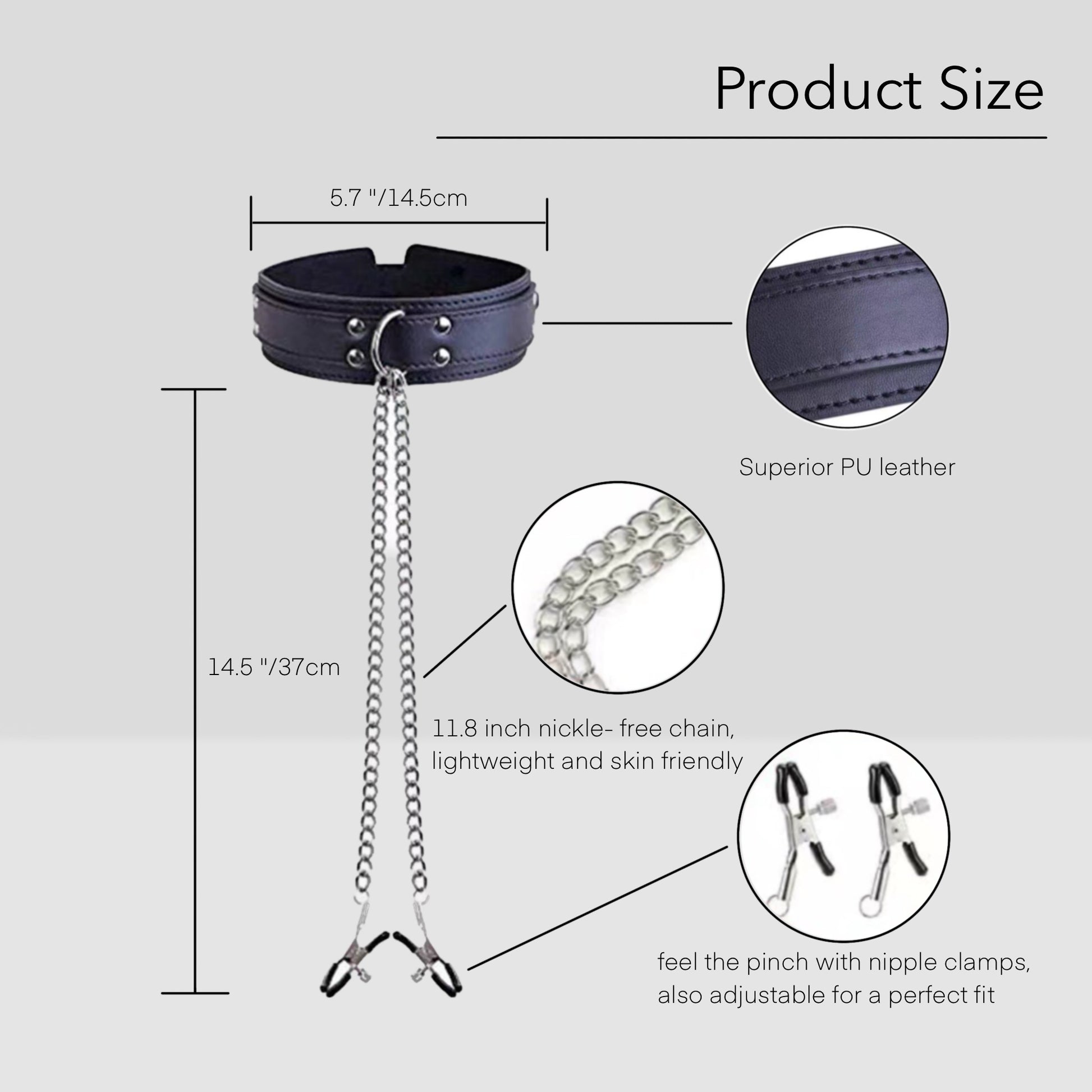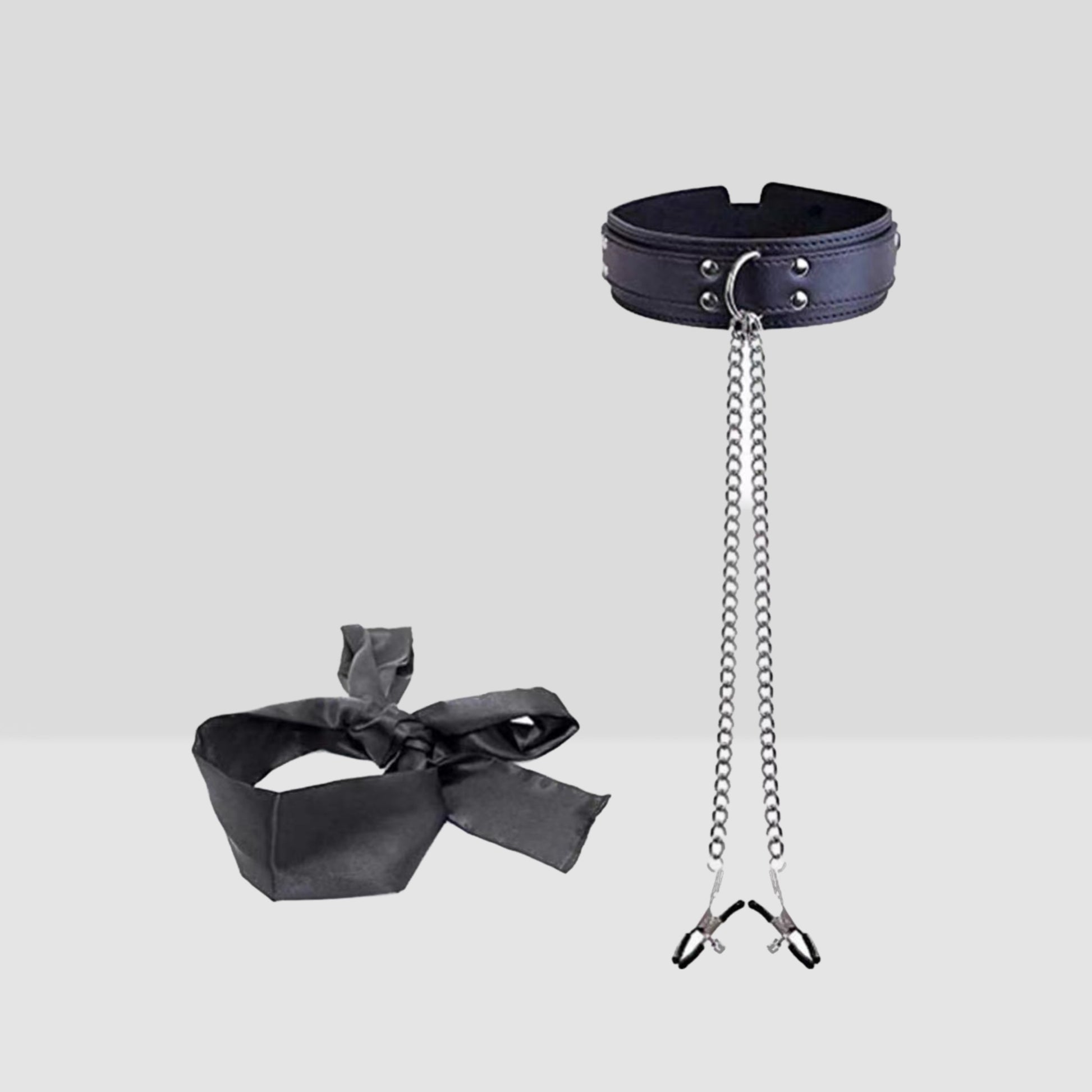 Silicone Collar, Satin blindfold and Nipple Clamps